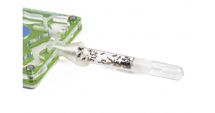 Unser 3D-Reagenzglas-Anschluss verhindert, dass Sie Ameisen gewaltsam übertragen, was ihnen manchmal unnötigen Stress bereitet. Die notwendigen Schläuche sind standardmäßig im Lieferumfang enthalten, um es an jedes unserer Modelle anschließen zu können.