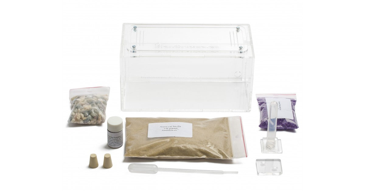 Der Anthouse_Anfänger-Acryl-Kit ist ein kleines Ameisennest des Typs Aquarium aus Plastik, das auf einer Seite eine Plastik-Folie hat (Sandwich-Ameisennest), einen Abstand von 1,5 cm lassend (dort werden die Ameisen mit der Königin leben), mit einem Deckel, ebenfalls aus Plastik. Die Nahrung wird auf den Ameisennest-Boden gelegt, was wir später mit Extrasand und einer kleinen Pflanze oder Steinchen dekorieren können.