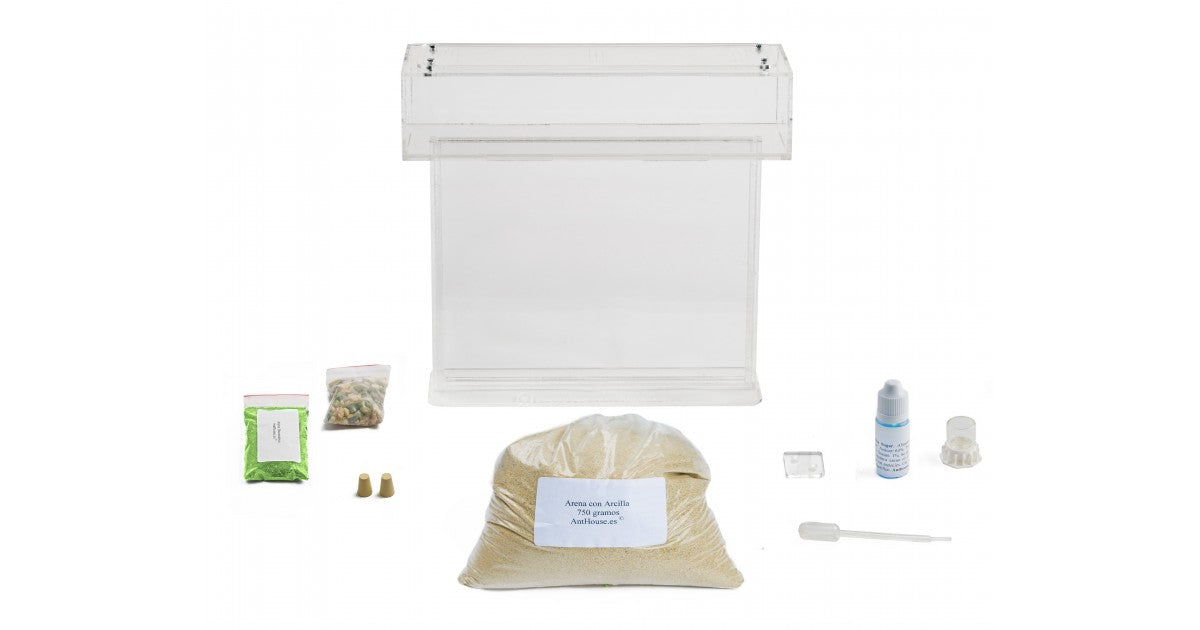 Das große Acryl-Kit  T  Modell besteht aus einem Acryl-Sandwich, das im oberen Bereich eine Futterschachtel enthält, die von den Ameisen sowohl als Futterzone, als auch als Müllablage verwendet wird...