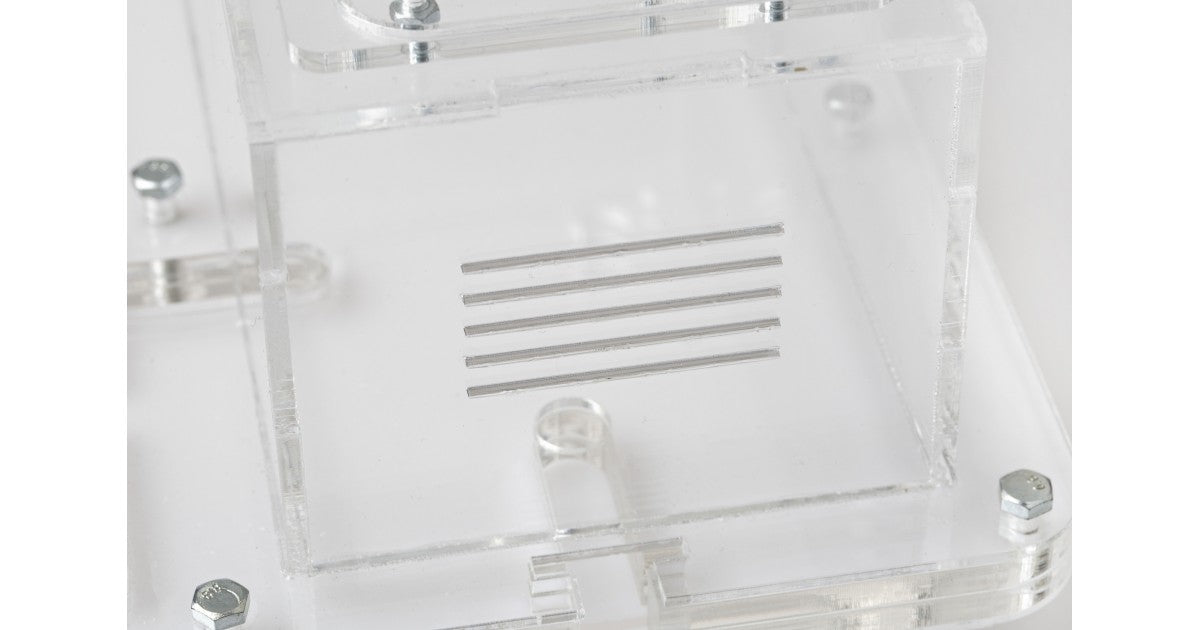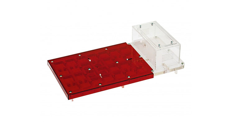 Ameisennest des Pilztyps aus Acryl mit den Maßen 40x20x1,5 cm, mit hoher Futterzone und einem Wasservorrat, um einen höheren Feuchtigkeitswert beizubehalten und eine bessere Sicht auf die Ameisen zu ermöglichen. Mit Gängen von 1,5 cm Höhe ist es perfekt für jede Spezies, sei es die Größte wie Camponotus oder die Kleinste wie Lasius.