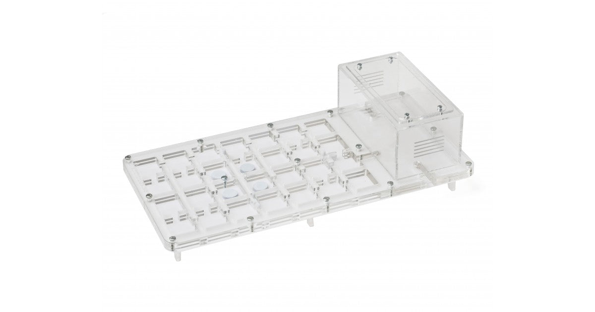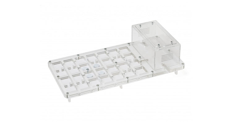 Ameisennest des Pilztyps aus Acryl mit den Maßen 40x20x1,5cms, mit hoher Futterzone und einem Wasservorrat, um einen höheren Feuchtigkeitswert beizubehalten und eine bessere Sicht auf die Ameisen zu ermöglichen. Mit Gängen von 1,5 cm Höhe ist es perfekt für jede Spezies, sei es die Größte wie Camponotus oder die Kleinste wie Lasius.