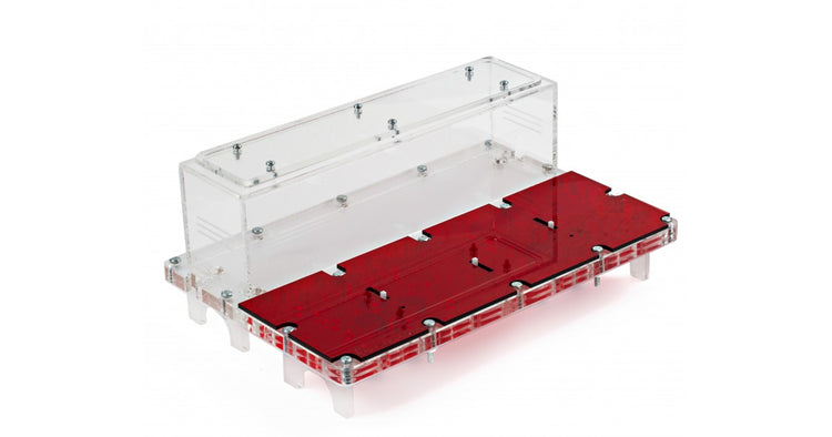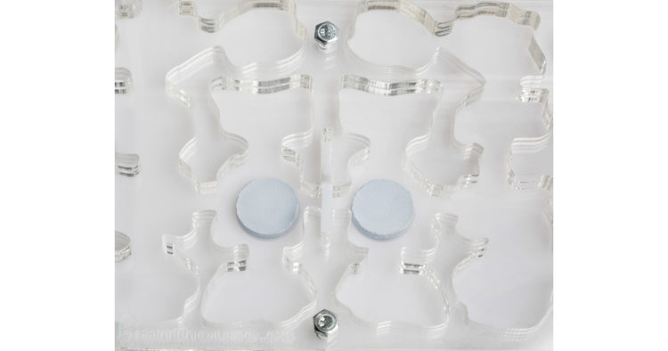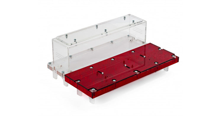 Ameisennest des Pilztyps aus Acryl mit den Maßen 20x30x1,5 cm, mit hoher Futterzone und einem Wasservorrat, um einen höheren Feuchtigkeitswert beizubehalten und eine bessere Sicht auf die Ameisen zu ermöglichen. Mit Gängen von 1,5 cm Höhe ist es perfekt für jede Spezies, sei es die Größte wie Camponotus oder die Kleinste wie Lasius.