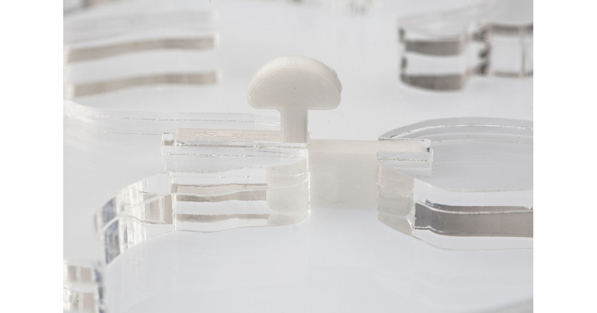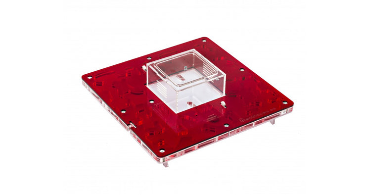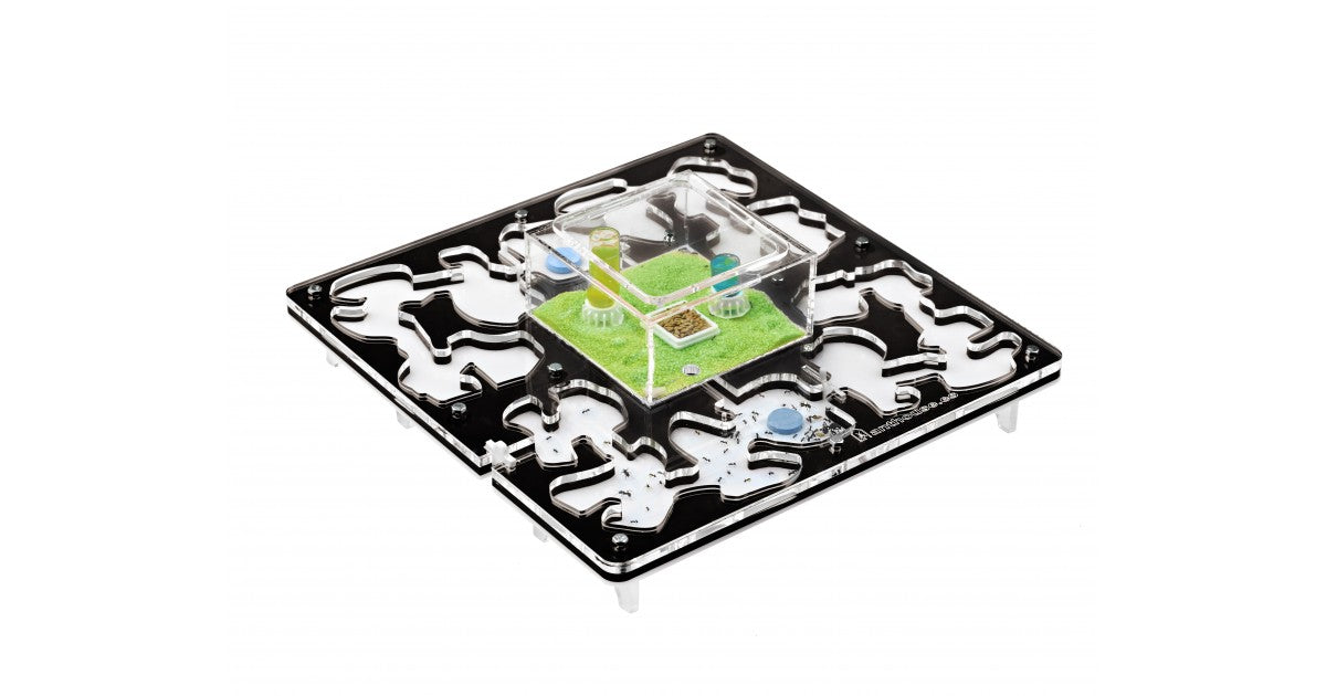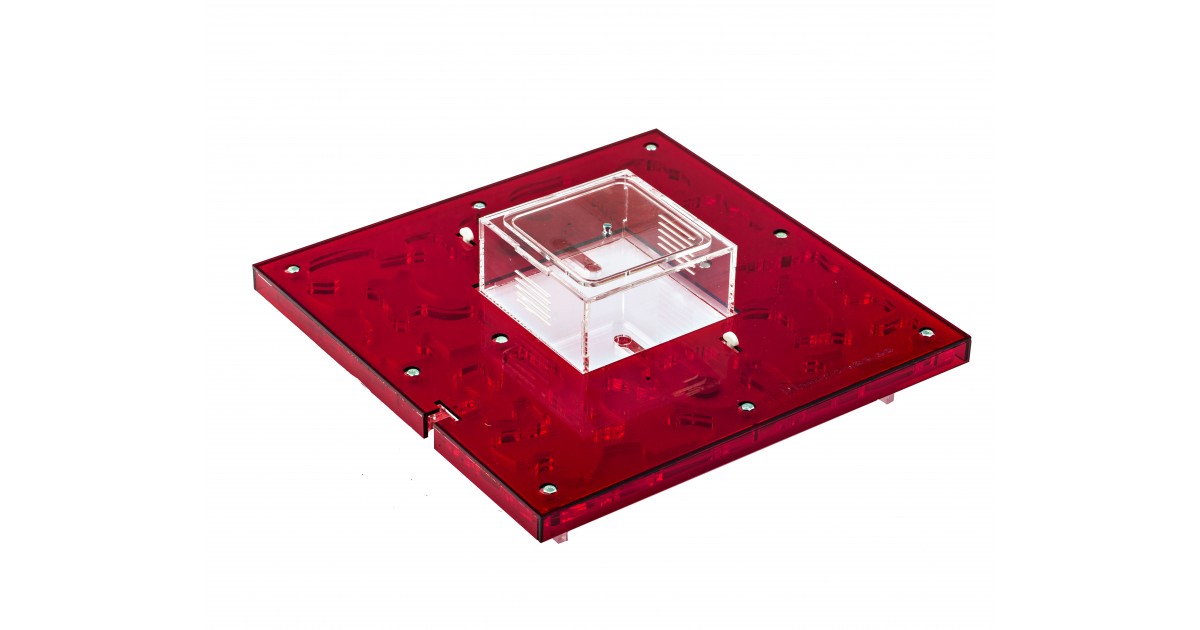 Ameisennest des Pilztyps aus Acryl mit den Maßen 30x30x1,5 cm, mit zentraler Futterzone und einem Wasservorrat, um einen höheren Feuchtigkeitswert beizubehalten und eine bessere Sicht auf die Ameisen zu ermöglichen. Mit Gängen von 1,5 cm Höhe ist es perfekt für jede Spezies, sei es die Größte wie Camponotus oder die Kleinste wie Lasius. Geteilt in zwei voneinander unabhängige Bereiche, ist es möglich, das Ameisennest an die Koloniegröße anzupassen.