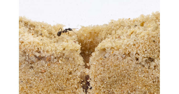 Ist das Ameisennest einmal aufgebaut, können wir, um den Ameisen das bauen von Gängen zu erleichtern, mit einem Zahnstocher ein kleines Loch schaffen. Später führen wir die Ameisen manuell ein, wir kippen, mit extremer Vorsicht, den Inhalt des Transportröhrchens auf den Sand im Sandwich, so nah wie es nur geht an dem Loch, das wir zuvor geschaffen haben, damit sie, wenn sie in den Sand fallen, einen Zufluchtsort haben.