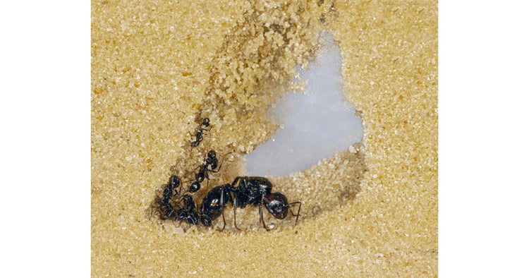 Es ist sehr wichtig, das Futter so nah wie möglich an die Ameisen heran zu bringen. Deshalb zögere nicht, es so nah es geht an die Öffnung oder an die Zone, in der sich die Ameisen aufhalten, zu legen. Vermeide dabei immer, den Sand zu verschmutzen. Eine Art, um zu überprüfen, dass die Ameisen essen, ist, zu schauen, ob sie einen angeschwollenen Gaster (Hinterteil) haben, da sie Nahrung in einem Sozialmagen als Reserve speichern.
